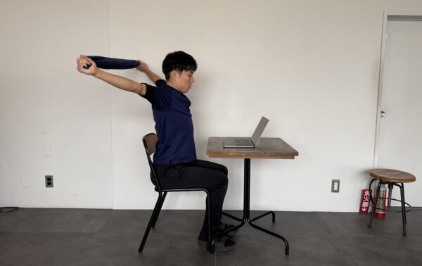 タオルを挟むように首を回すと首全体がほぐれますよ