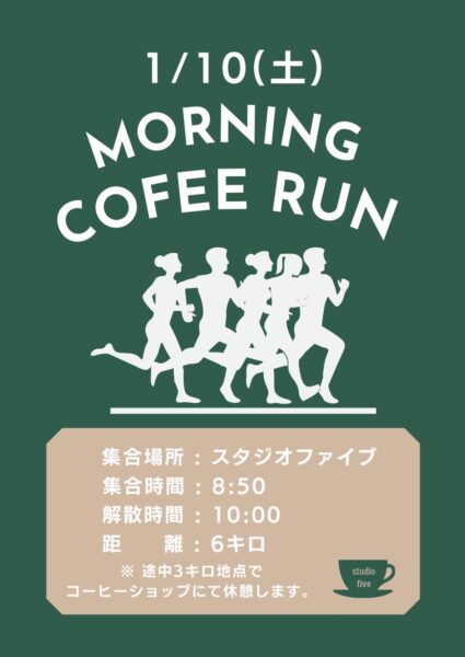 2026.01.09 走り初めお待ちしております! お知らせ こんにちは! スタジオファイブです。 明日1月10日(土)は 新年一発目のモーニングランを開催いたします! 今回は、寒い日のランニングにぴったりの温かいコーヒーを求めて、途中コーヒー屋を経由するルートで走りたいと思います ! ・集合場所 studio5前 ・距離 6km ・集合 8:50 ・解散 10:00 皆様の走り初めお待ちしております!☆ ~準備するもの~ 運動着、防寒着、飲み物(自販機もございます) この記事をシェアする!